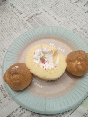 デザートには、ロールケーキとプチシューを、カラースプレー飾りつけ♡